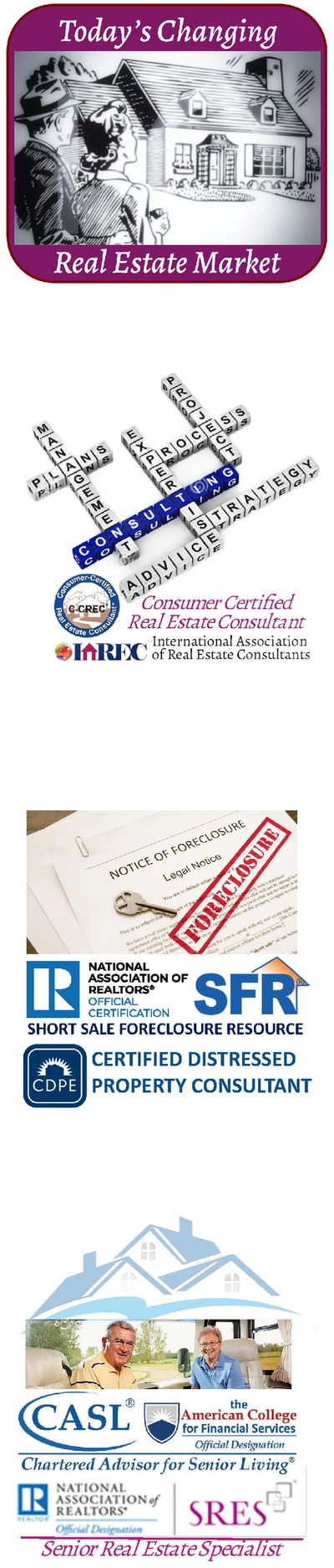 As a Short Sale and Foreclosure Resource and a Certified Distressed Property Consultant I help homeowners assess their situation and guide them through the process. This process includes assembling information needed, pricing the property, developing an exit strategy and contacting the mortgage company on the homeowner’s behalf. The exit strategy taken depends on whether the homeowner desires to remain in the home or is resigned to moving on. This process is also applicable to property owners who wish to just liquidate unwanted property.